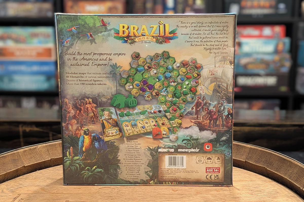 In more detail, while playing in a modular map board that recreate real regions, you use a combination of worker placement, area majority, and individual powers to construct an empire in Brazil between the 16th and 19th centuries. You start by choosing one of the available monarchs and its personal game board and components; some monarchs are strong in combat, while others prioritize science or exploration. You receive tasks that advance you to a new era when you complete them, giving you access to more power constructions as you move into the second and third eras of the game, then you choose a starting point on the shared map.