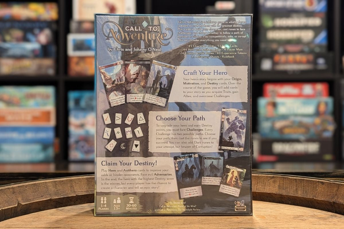 Call to Adventure challenges 1-4 players to build a fantasy hero and achieve a heroic destiny. Inspired by fantasy storytelling and tabletop RPGs, Call to Adventure is a game for anyone who loves building a character's backstory. Each player begins with an Origin, a Motivation, and a Destiny. From there, players take their heroes on an adventure where they acquire Traits, face Challenges, gain Allies, and defeat Adversaries. By the end of the game, each player has crafted the story of their hero, but only the Hero with the most destiny points will emerge victorious.