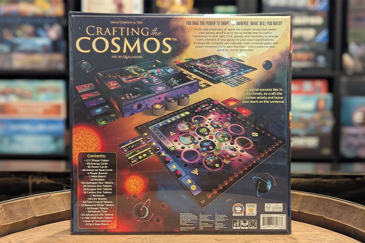 In Crafting the Cosmos, you are interstellar architects, competing to build the galaxy – one star at a time. Manipulate the laws of the universe to your advantage, shifting gravity or the flow of time to activate useful Power Cards, and even spawn Advanced Life that can earn you extra victory points at the end of the game. Use your resources wisely as you craft your cosmic creation.