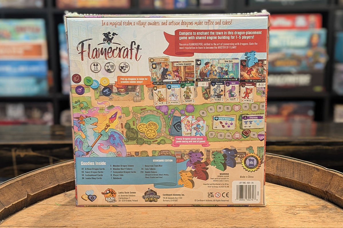 In Flamecraft, 1-5 players take on the role of Flamekeepers, gathering items, placing dragons and casting enchantments to enhance the shops of the town. Dragons are specialized (bread, meat, iron, crystal, plant and potion) and the Flamekeepers know which shops are the best home for each. Visit a shop to gain items and a favor from one of the dragons there. Gathered items can be used to enchant a shop, gaining reputation and the favors of all the dragons in the shop. If you are fortunate enough to attract fancy dragons then you will have opportunities to secure even more reputation.