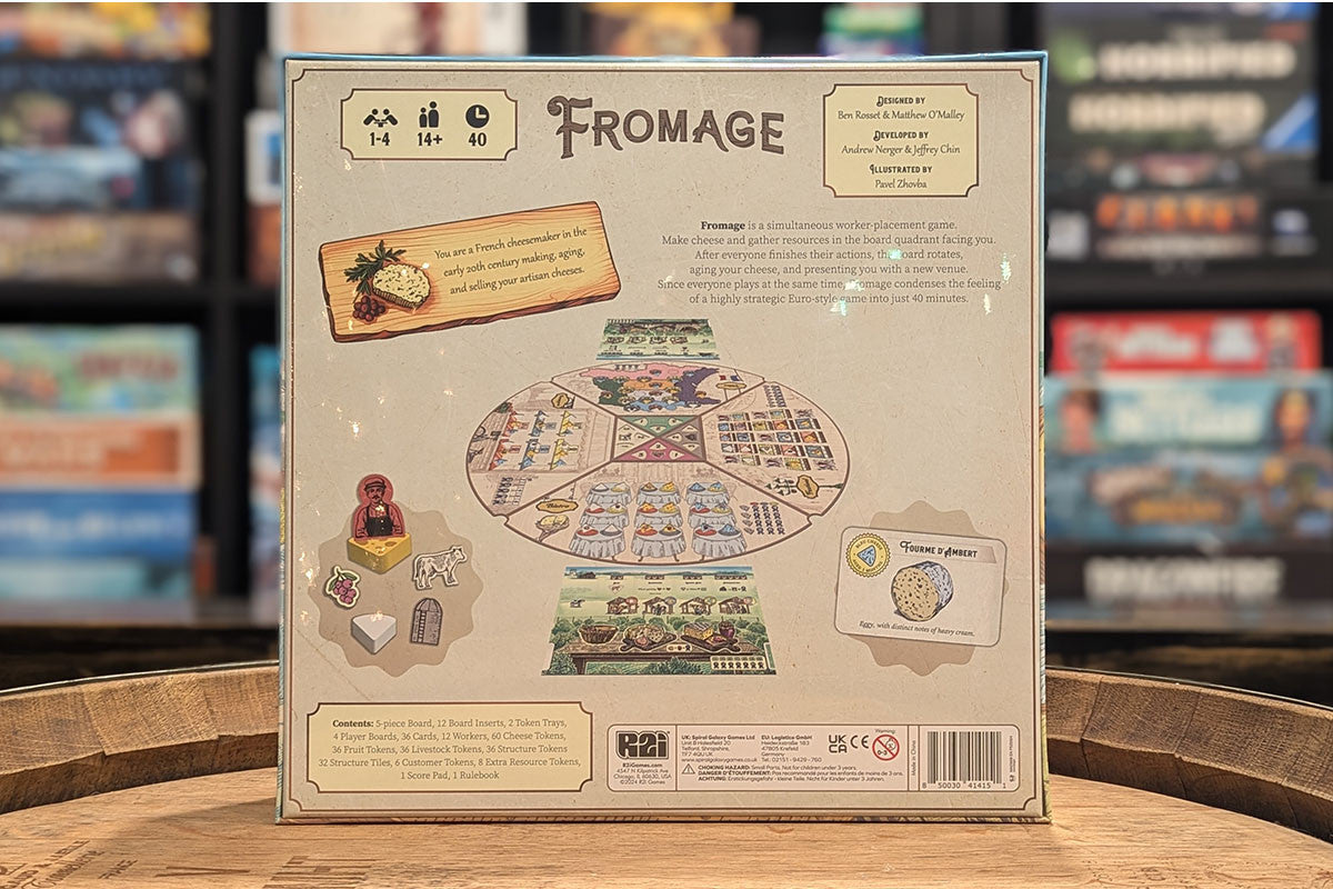 Fromage is a simultaneous worker-placement game where players place Workers to make cheese and gather resources from the quadrant of the board facing them. Once all players have placed their Workers, the board rotates, aging any cheese that was made, and presenting each player with a new quadrant to place Workers into. Score Prestige Points by selling cheese to the four locations, and by efficiently managing and upgrading your creamery.
