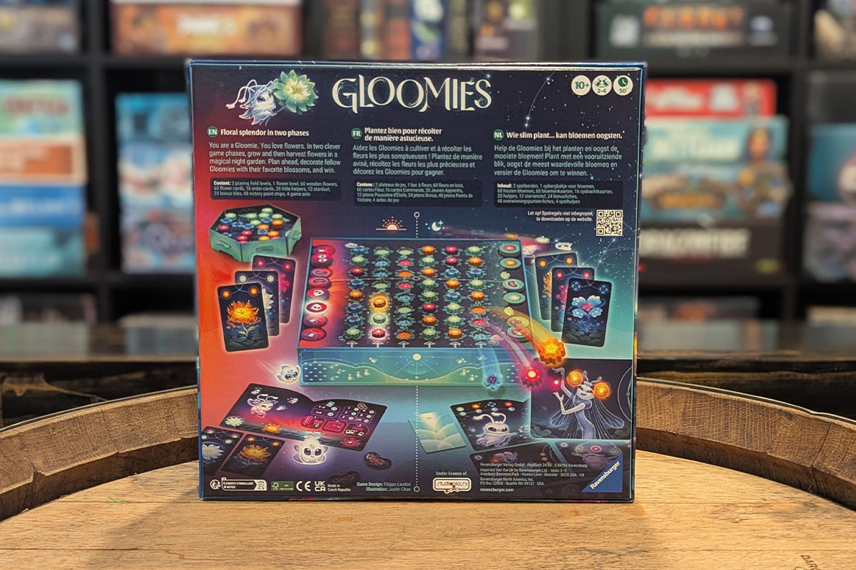 Meet the Gloomies - little creatures from outer space who like to adorn themselves with beautiful, galactic flowers. In the dark of night, the aim is to first sow these magical flowers on the playing field and then harvest them again in the second half of the game. Whoever uses their playing cards most skillfully and collects valuable additional rewards will score the most points in the two phases of this simple strategy game. With easy-to-understand rules, lovingly designed wooden flowers and atmospheric illustrations, Gloomies creates the perfect feel-good atmosphere in every round of the game.