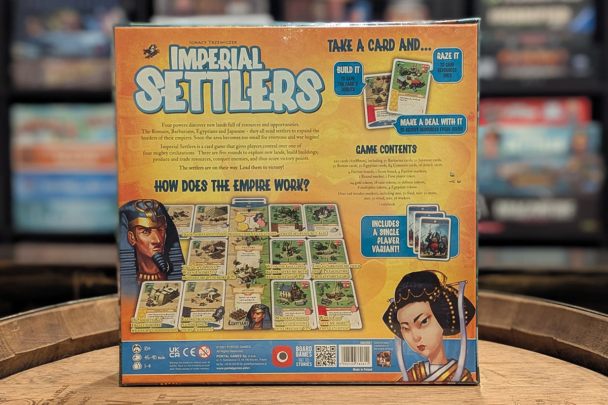 Imperial Settlers is a card game that lets players lead one of the four factions and build empires by placing buildings, then sending workers to those buildings to acquire new resources and abilities. The game is played over five rounds during which players take various actions in order to explore new lands, build buildings, trade resources, conquer enemies, and thus score victory points.