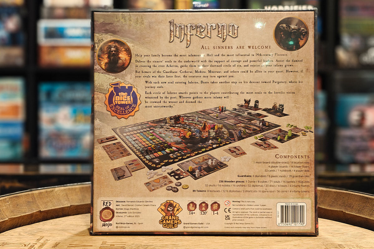 Inferno is a worker placement/ soul management game where each player must guide sinners to their respective circles in Hell. The central board consists of two parts: one displaying all 9 circles and the soul registry, while the other represents Florence in the early 14th century, where Dante lived, with its power games and palace intrigues.