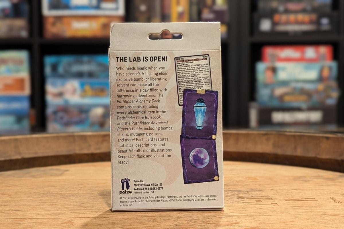 Just as an alchemist's formula book holds the key to crafting alchemical items, the Pathfinder Alchemy Deck contains cards for every alchemical item from the Pathfinder Core Rulebook and the Advanced Player's Guide. Each card holds the item's statistics, a description, and a beautiful full-color illustration so you can see every item in your collection! Whether you're a GM building an alchemist's stall or a player assembling a formula book, the Alchemy Deck keeps your reagents at your fingertips!