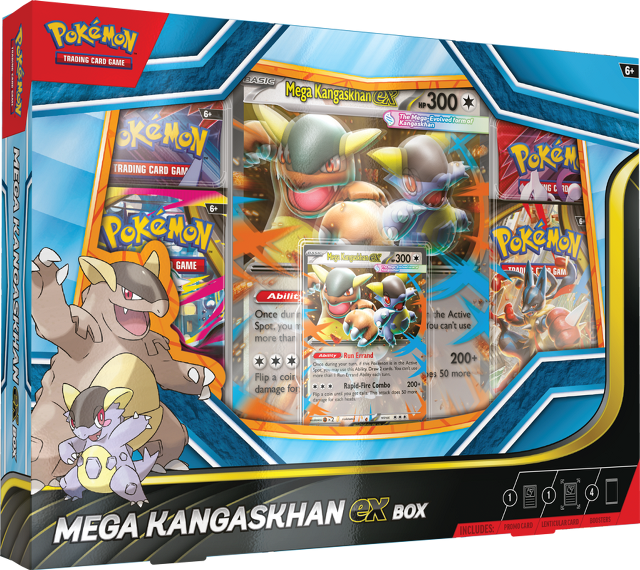 Mega Evolution makes Kangaskhan’s child a force to be reckoned with—and both of them combine their powers as Mega Kangaskhan ex! Draw extra cards with Run Errand, then use Rapid-Fire Combo and flip coins to seek bigger damage. Team up with Mega Kangaskhan ex as a playable foil promo card and an oversize lenticular version for display, then open four booster packs to find even more cool cards!