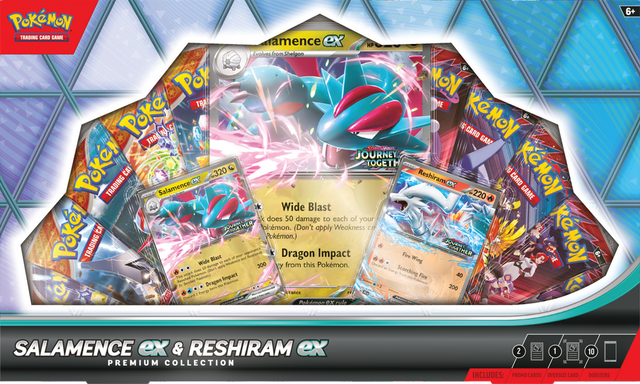 Join Forces with a Pair of Powerful Pokémon ex! With strong attacks and big HP, Pokémon ex aim to blow through the opposition in battle! In this collection, you get specially stamped foil promo cards of Salamence ex and Reshiram ex, plus an oversize foil version of Salamence ex for display. Then, discover even more awesome Pokémon inside a big stack of 10 booster packs!
