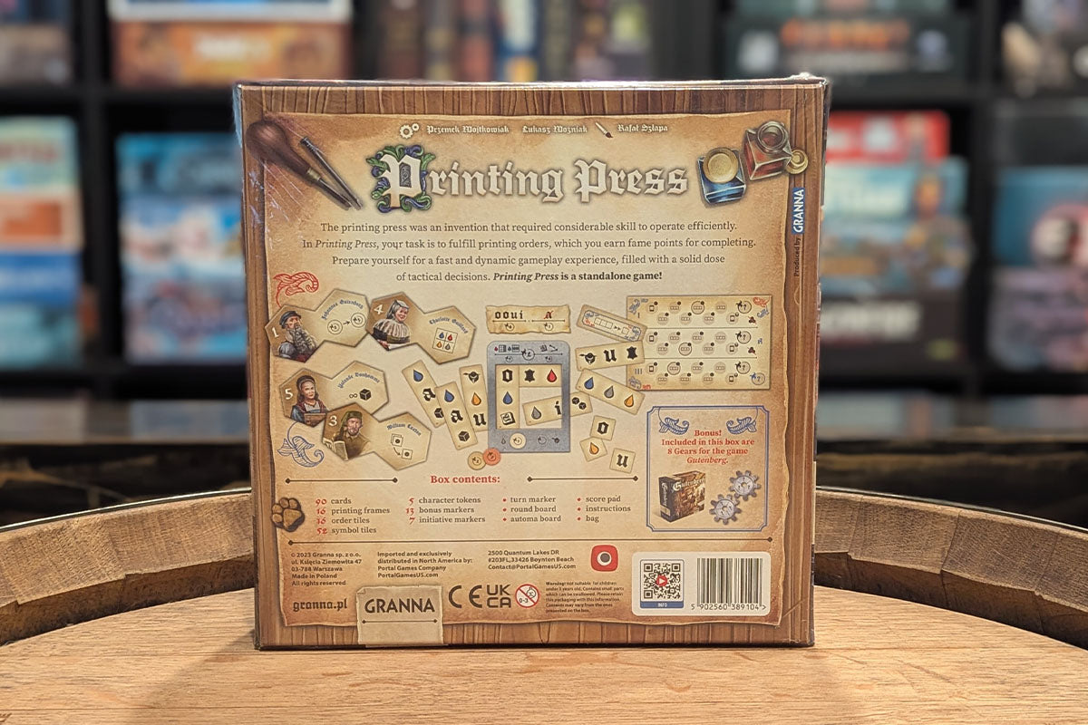 Dive into the vibrant legacy of Gutenberg with its spirited successor, the Printing Press board game! The game invites you to master the art of Renaissance publishing, where careful planning and craft are crucial for success. Immerse yourself in the fascinating world of 16th- century publishing as you compete against your fellow players to create the most prestigious print shop of the Renaissance era. Printing Press is a family game where you must excel at drafting, not only with the right cards but also with the dedicated plate and frame pair. Players strive to achieve the best possible set over 4–6 rounds, depending on the difficulty level they choose. Pick the best lettering, inscriptions, and coloring for the book and create the volume to rule them all!