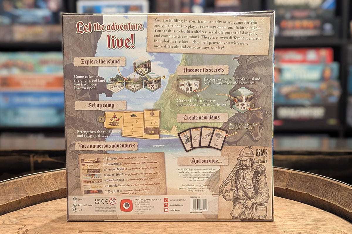 Trzewiczek takes the players to a deserted island, where they'll play the parts of shipwreck survivors confronted by an extraordinary adventure. They'll be faced with the challenges of building a shelter, finding food, fighting wild beasts, and protecting themselves from weather changes. Building walls around their homes, animal domestication, constructing weapons and tools from what they find, and much more await them on the island. The players decide in which direction the game will unfold and – after several in-game weeks of hard work – how their settlement will look. Will they manage to discover the secret of the island in the meantime? Will they find a pirate treasure, or an abandoned village? Will they discover an underground city or a cursed temple at the bottom of a volcano? Answers to these questions lie in hundreds of event cards and hundreds of object and structure cards that can be used during the game...