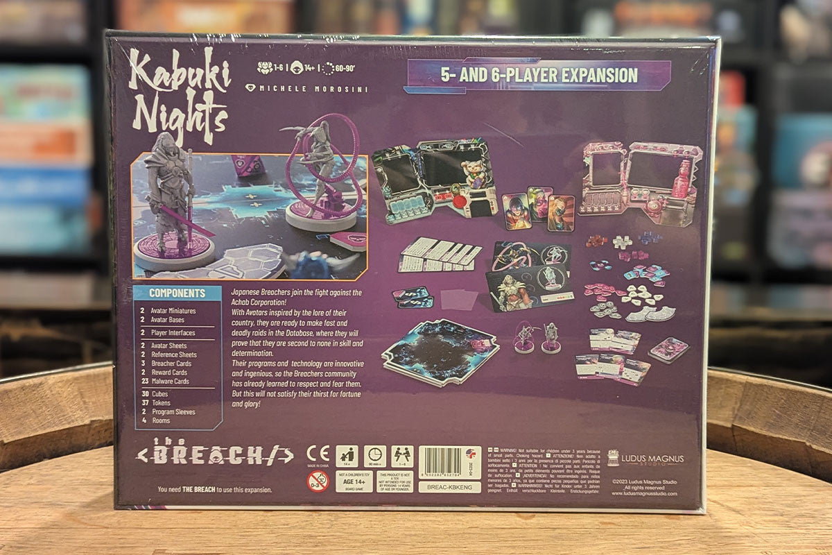 The expansion, with a strong oriental flavor, adds more variety to the game by introducing new combinations between Breachers and Avatars. It also allows for games with up to 6 players. Inside the expansion, there are 2 new Breachers: Okami and Oni, and 2 new Avatar models: Gura and Kusari. In addition, Kabuki Nights includes all the material needed to play with 2 additional players: two new Player Interfaces (also with Japanese inspiration), Code Cubes, cards, and tokens.