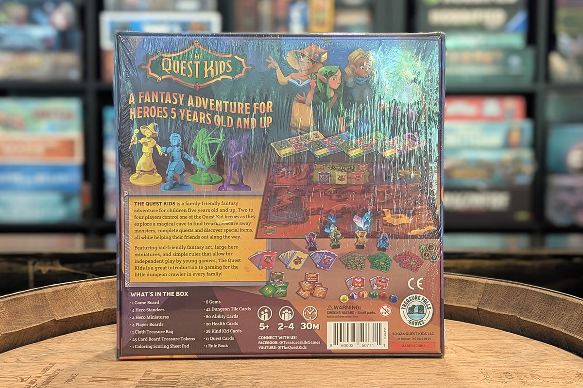 Your child's first fantasy adventure awaits! The Quest Kids is a critically acclaimed fantasy board game adventure for children 5 years old and up. In the game players will control up to four of the Quest Kids as they explore the magical Tolk's Cave to find treasure, scare away monsters and discover magical items, all while helping their fellow Quest Kids along the way.