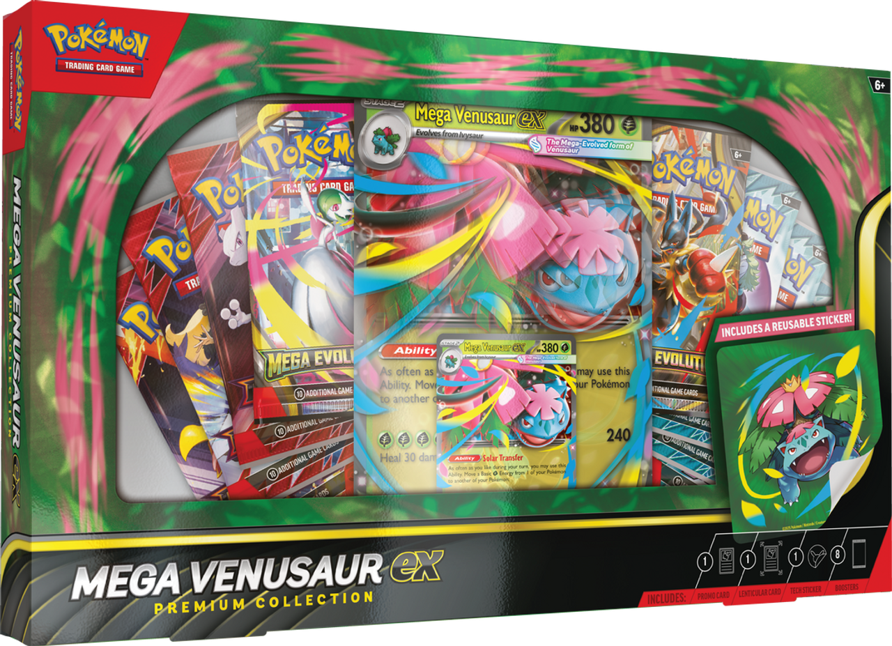 Keep your Pokémon at full power with help from Mega Venusaur ex! Its Solar Transfer Ability lets you move Grass Energy among your Pokémon as you please, ensuring you’re always ready to attack. In this collection, you get a playable foil promo card and an oversize lenticular promo card featuring Mega Venusaur ex, along with a tech sticker for decorating devices, binders, and notebooks. You’ll find even more Pokémon inside a stack of Pokémon TCG booster packs.